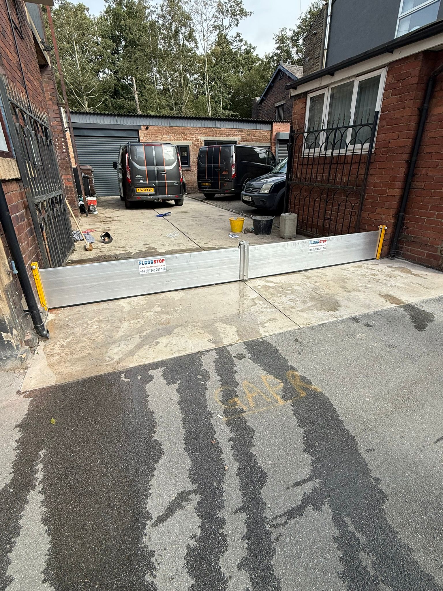 Install at front boundary (where driveway meets public path) removeable flood barrier with retractable mounting post on driveway